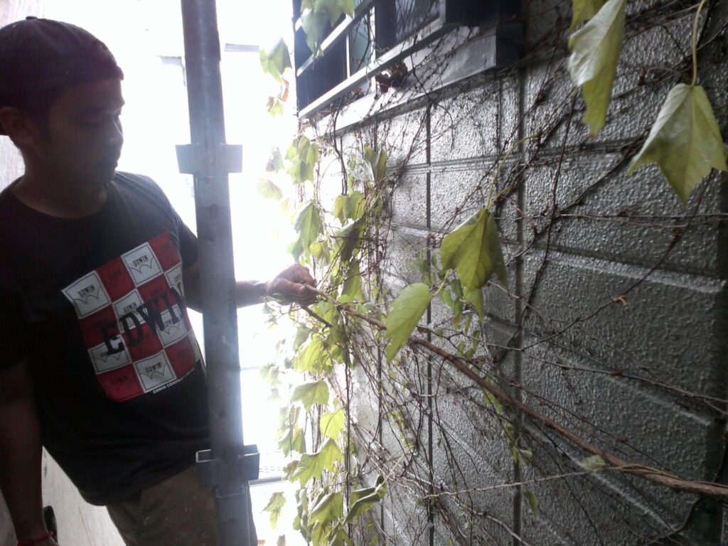 外壁に傷をつけないように手で慎重にツタを剝がしていきます