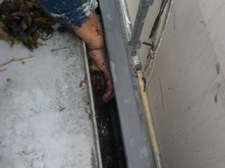 溜まった落ち葉やゴミを取り除き後に洗浄も行います
