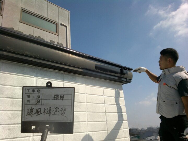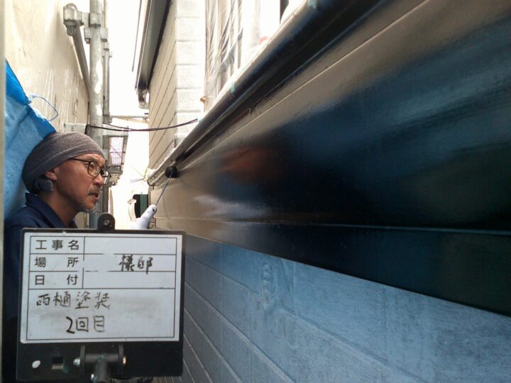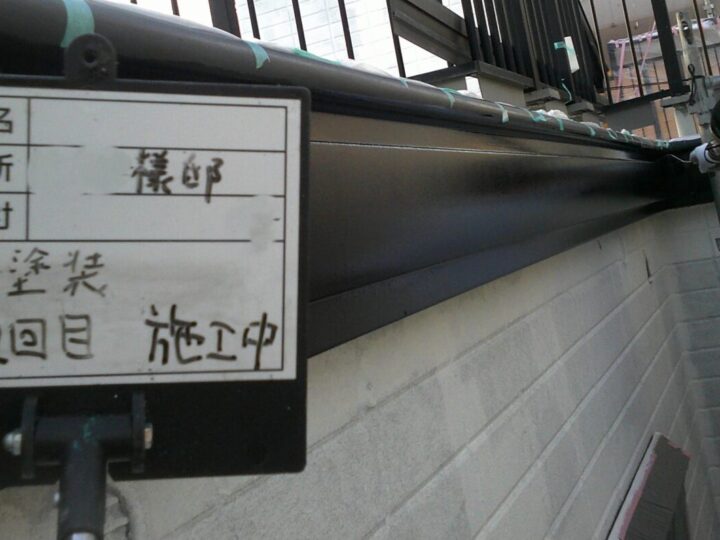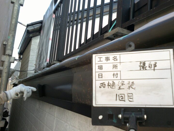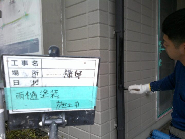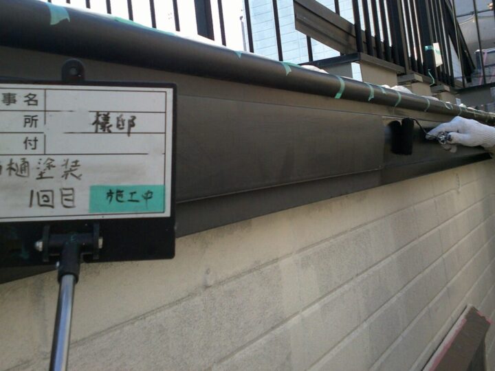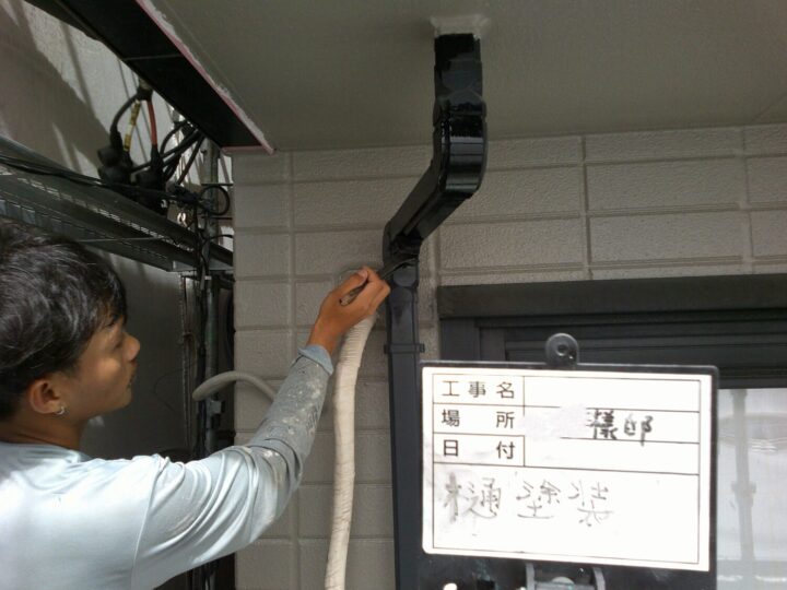 屋根や外壁の排水に非常に役に立っている部分ですので、劣化を防ぐ為です雨樋塗装 1回目