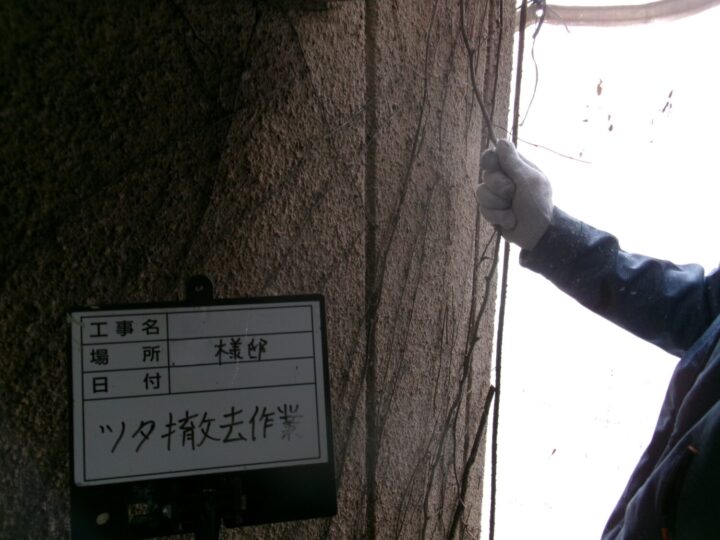 外壁に傷をつけないように手で慎重にツタを剝がしていきます