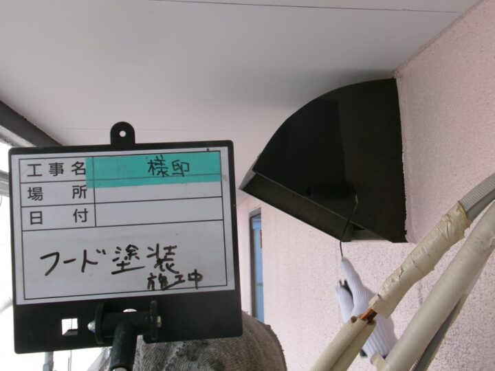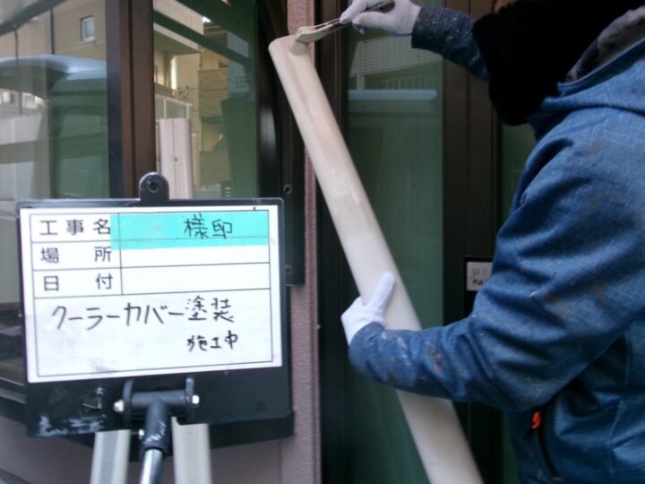 弊社では必ずクーラーカバーを外して外壁塗装をして、更にクーラーカバーも塗ってから、取り付けるようにしてます。